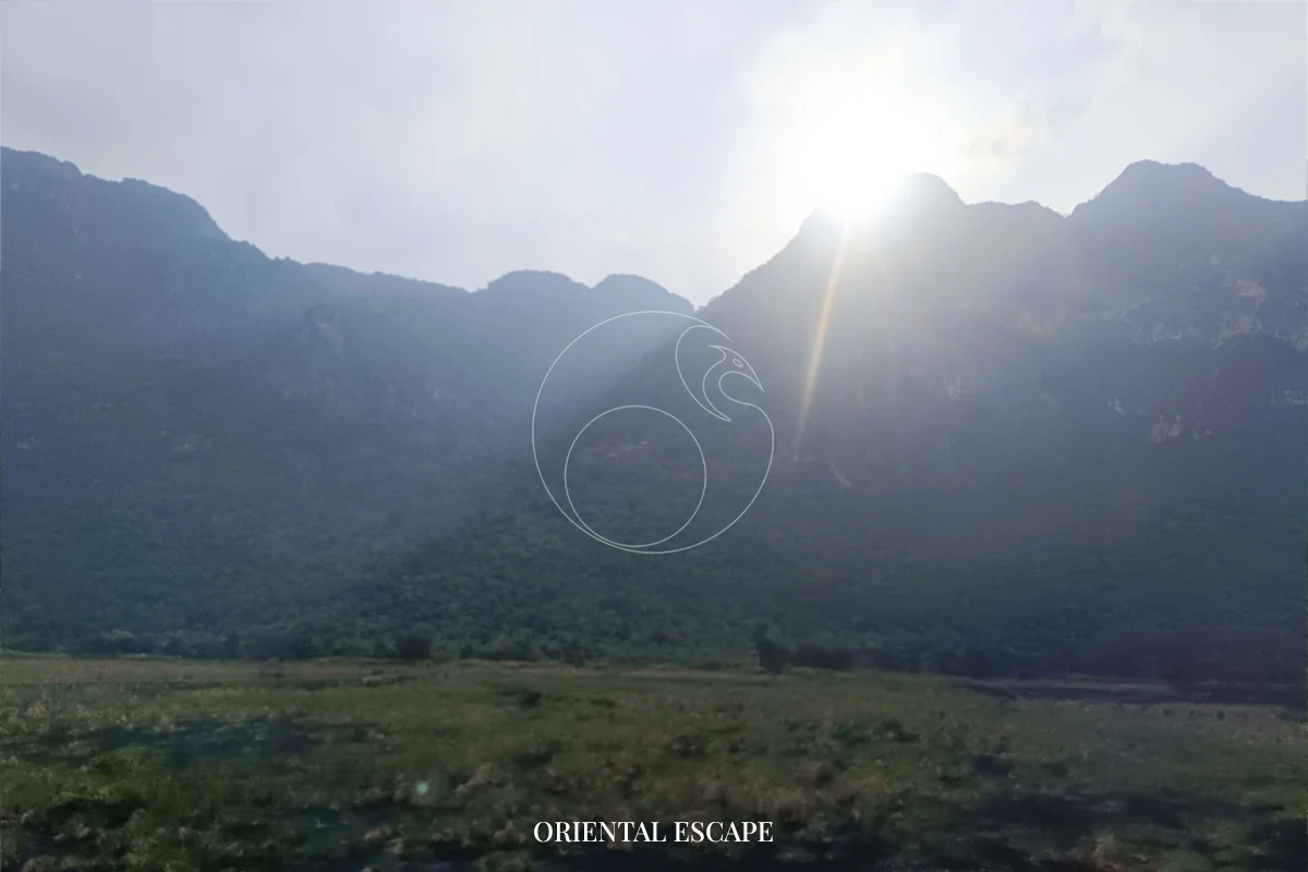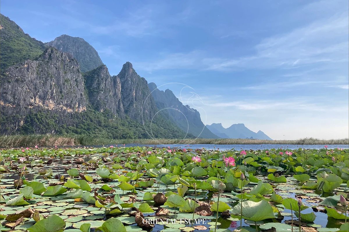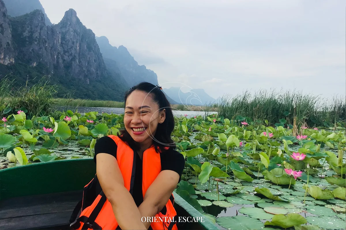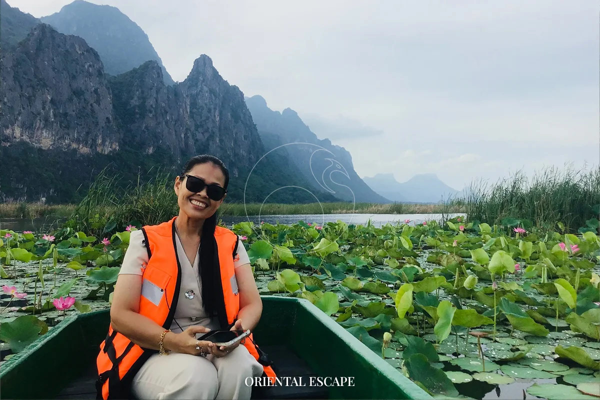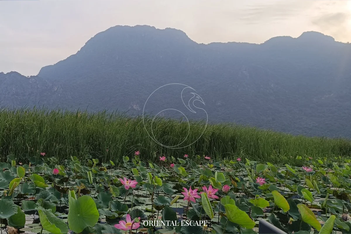 Arrive just as the sun rises over the limestone mountains, casting golden light across the vast lotus pond.