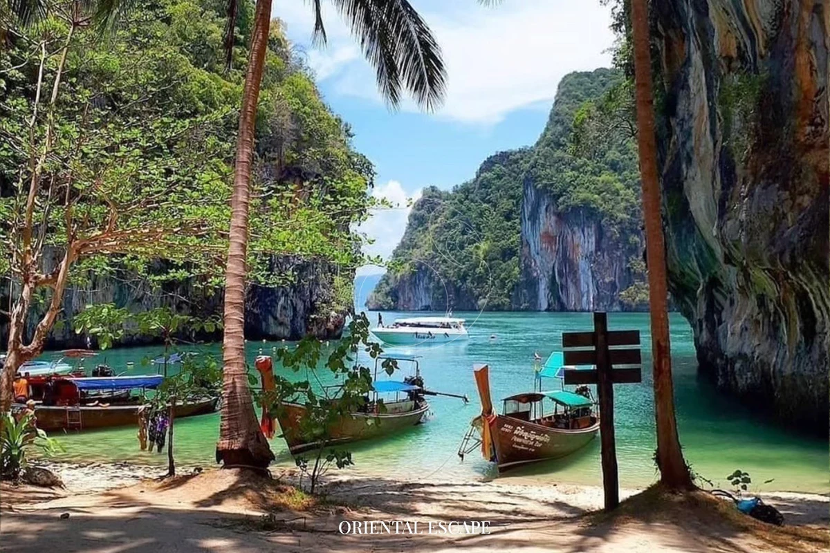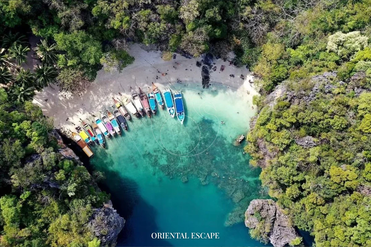 Cruise slowly into this breathtaking emerald lagoon, surrounded by towering limestone cliffs – a perfect place for photos and serenity.