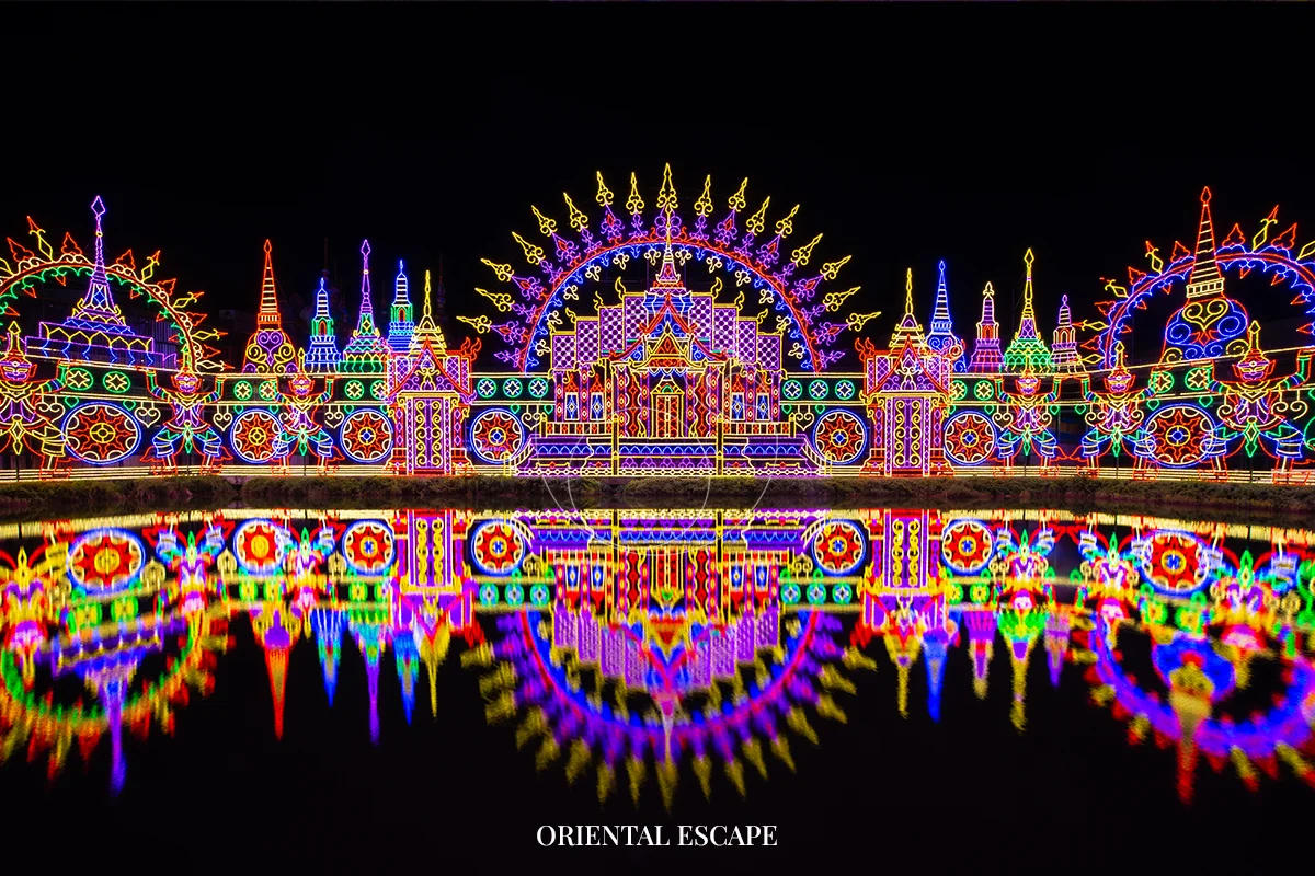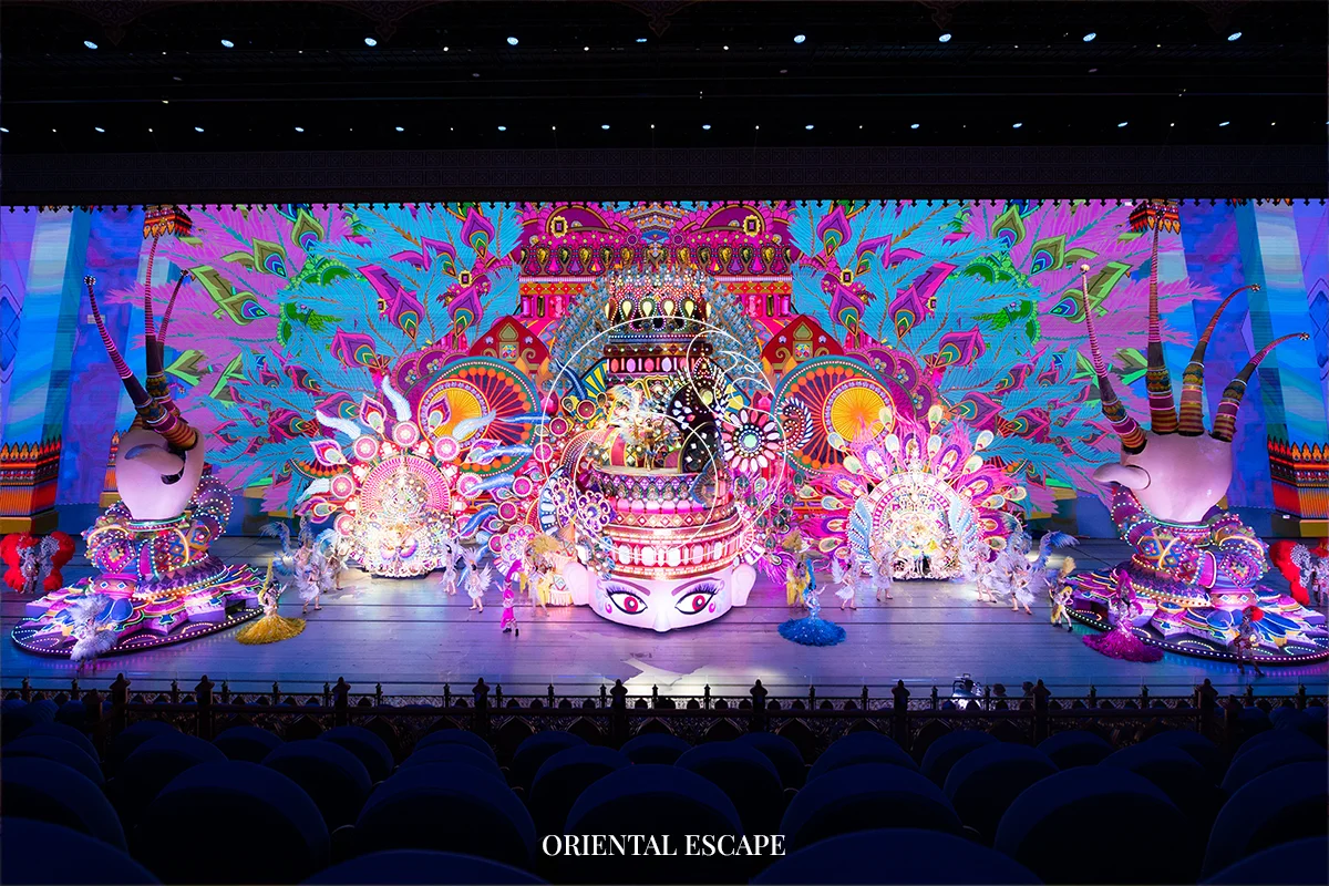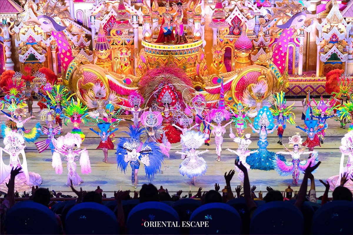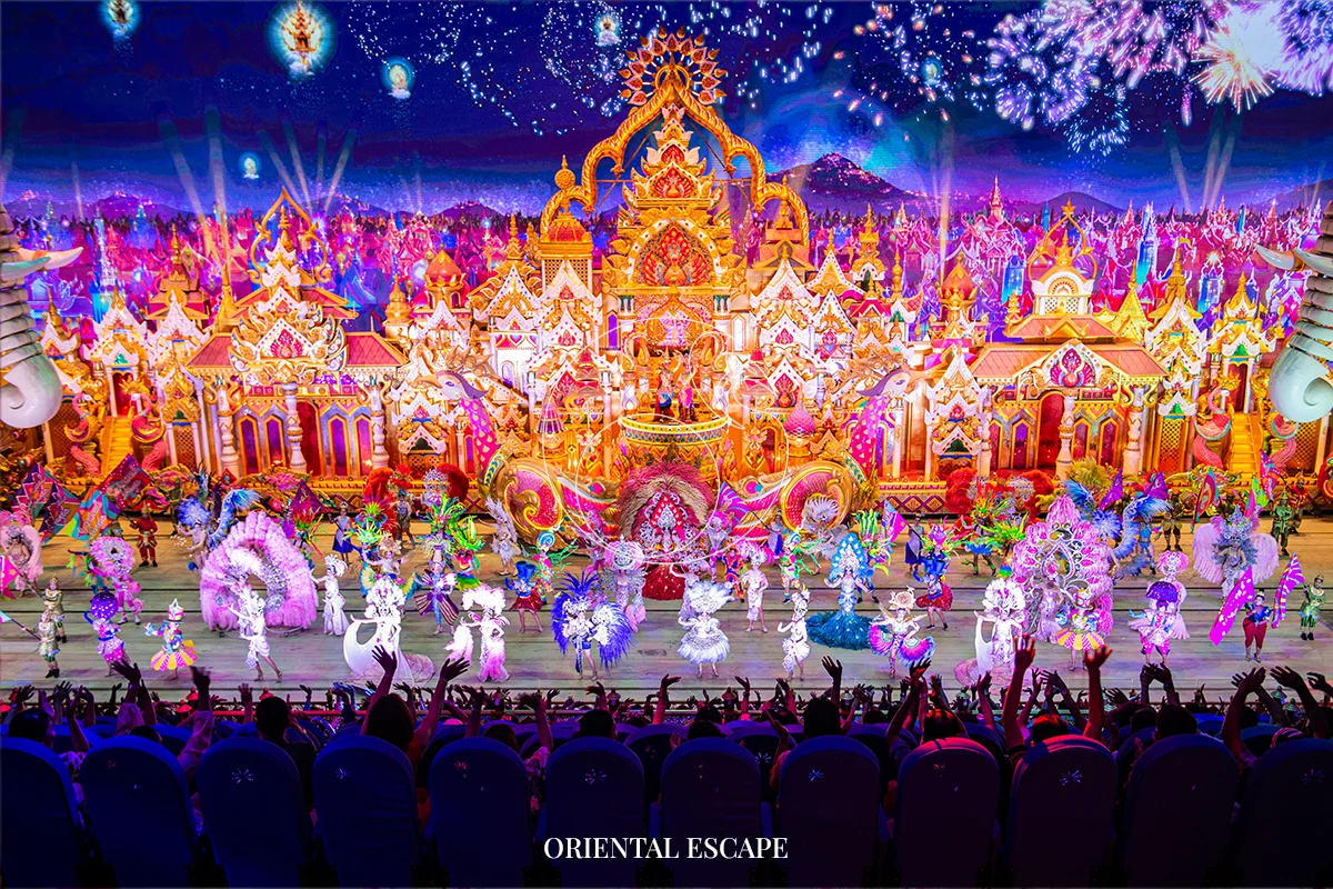 Enjoy an unforgettable performance featuring gigantic parade floats, glittering costumes, acrobatics, aerial acts, and dazzling special effects inspired by Thai carnival culture.